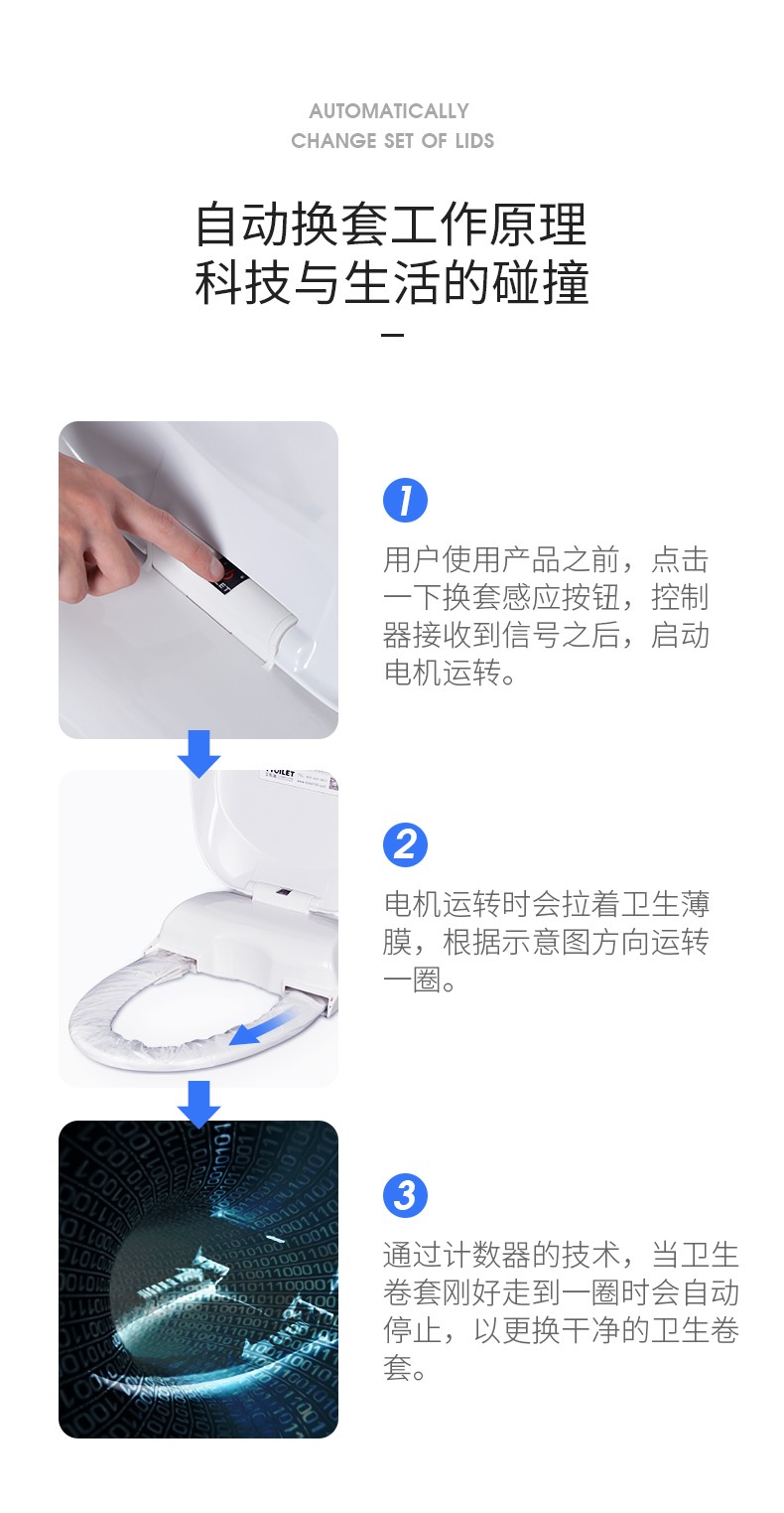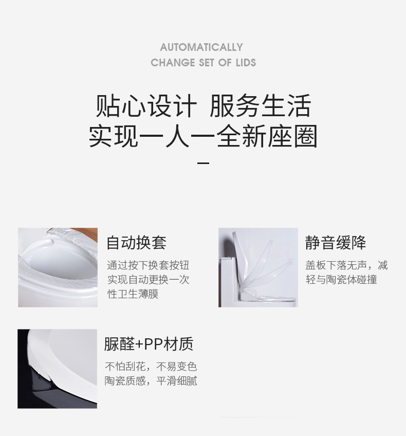 1、自动换套:自动更换一圈便洁套,达到“一人一换,卫生看得见”的效果。 2、一体化舱盖:一体式设计,无缝连接,大方美观,易清洁。