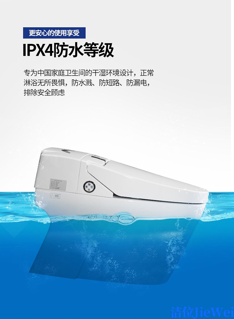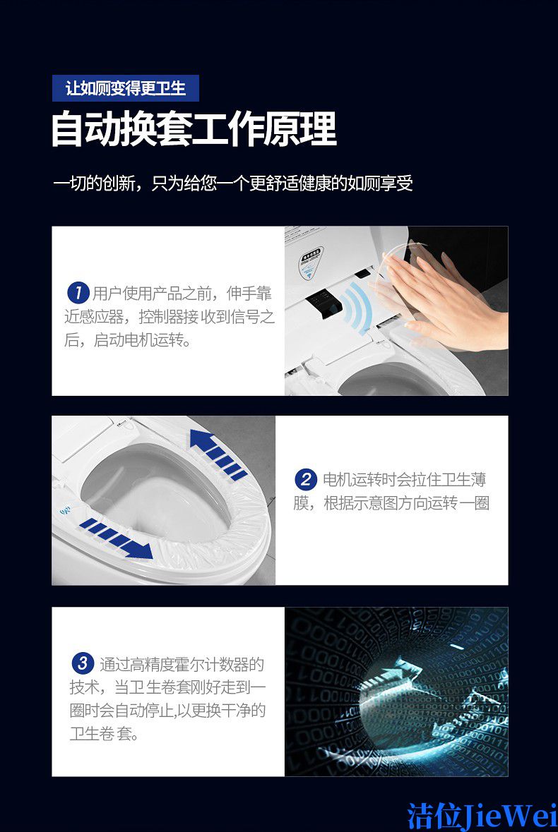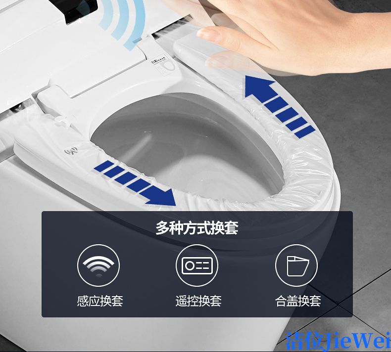 功能:抗菌,除臭,自动冲洗,高效节电,智能夜灯,功能指示灯,红外线遥控,自动换套功能,无水箱设计,自动恒温座垫,静音缓降盖板,漏电保护;